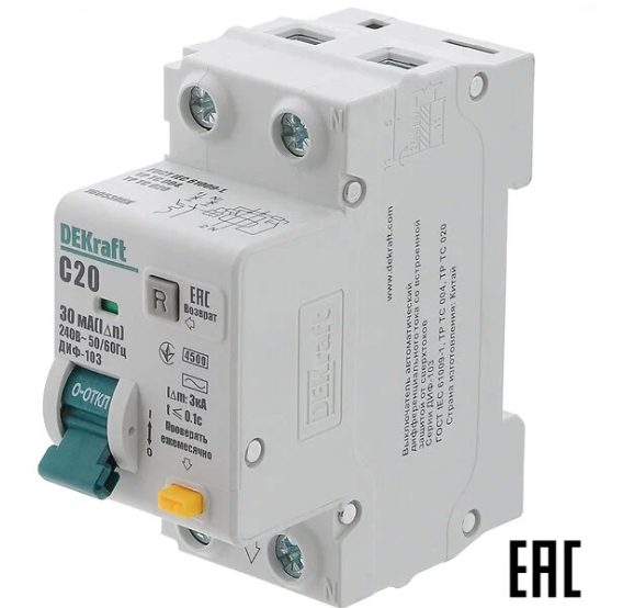 Автоматический выключатель дифференциального тока DEKraft 1Р+N 20А 30мА тип AC х-ка C ДИФ-103 4.5кА