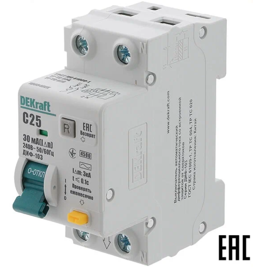 Автоматический выключатель дифференциального тока DEKraft 1Р+N 25А 30мА тип AC х-ка C ДИФ-103 4.5кА