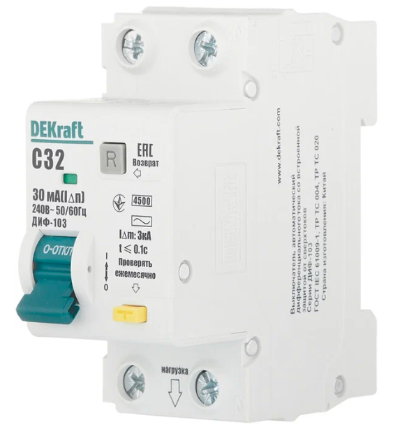 Автоматический выключатель дифференциального тока DEKraft 1Р+N 32А 30мА тип AC х-ка C ДИФ-103 4.5кА