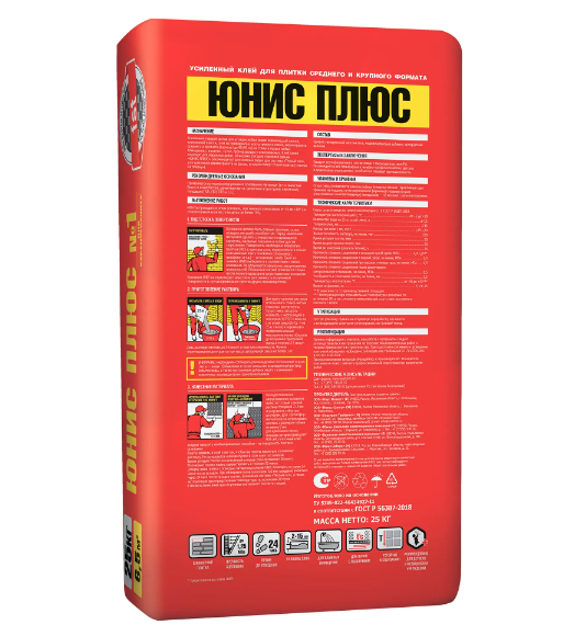 ОписаниеКлей для плитки Unis Плюс - усиленный клеевой состав для укладки любых видов керамической плитки, клинкерной плитки, плит из природного и искусственного камня, керамогранита среднего и крупного формата (до 90х90 см) на стены и полы в любых помещениях: влажных, сухих, промерзающих и отапливаемых. Клей также подходит для наружных работ, облицовки фасадов и цоколей зданий.