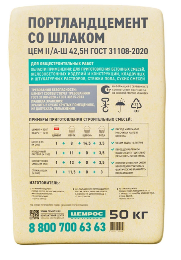 Бренд Цемрос Основной материал Цемент Поверхность применения Бетон Быстросхватывающийся Нет Тип применения Ручной Тип продукта Цемент Марка смеси M-500 Тип работ Наружные и внутренние Срок годности 12 Вес 50 Температура работ +5 - +30 С Страна производства Россия -